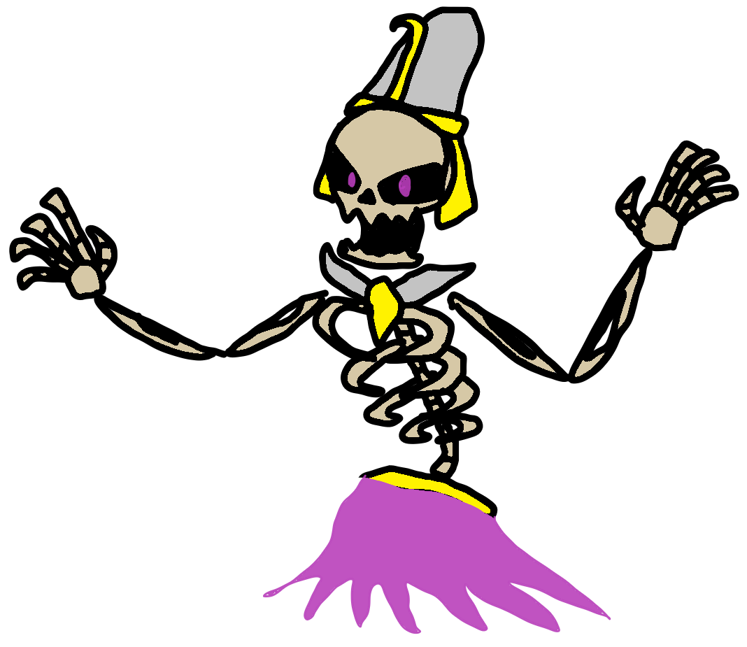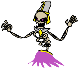 Albardiu is a huge skeleton with Egyptian clothing. It has no lower half body, instead having a purple flame 'dress'. Its eyes glow purple and it towers above the player.
